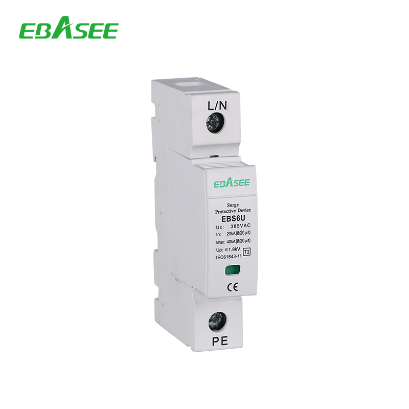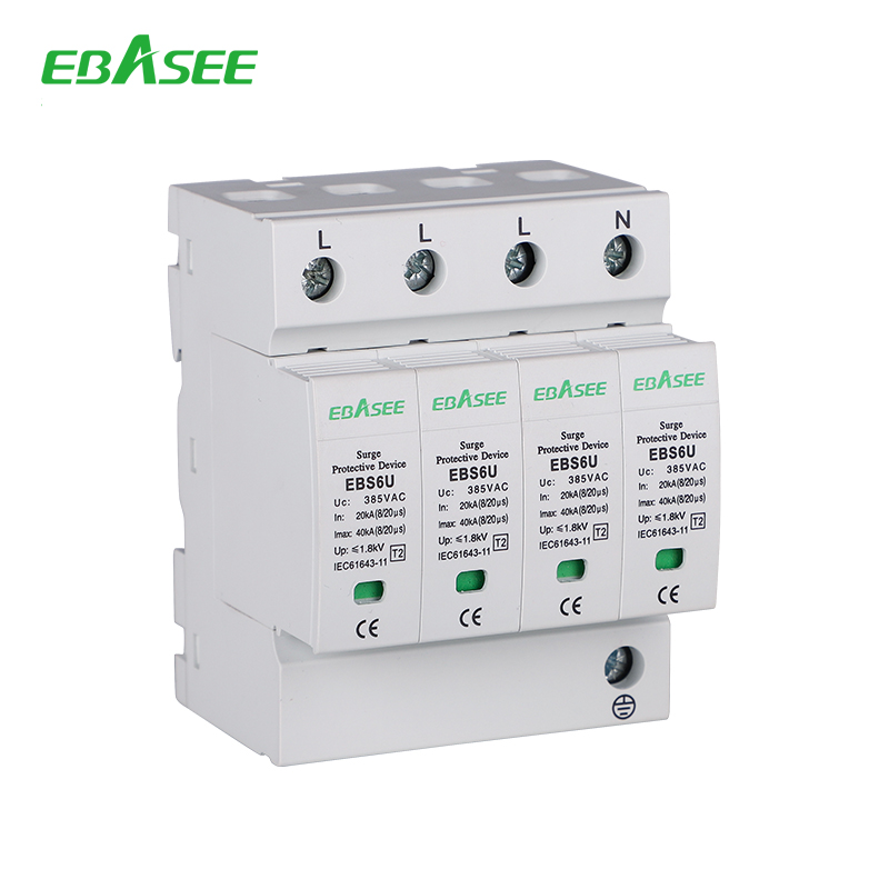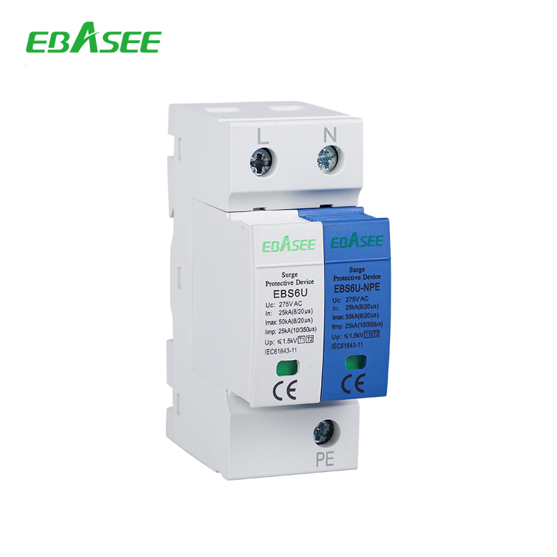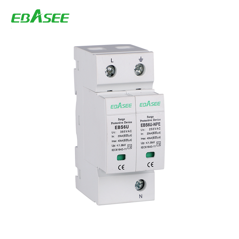 EBS6U Series Surge protector device(hereinafter referred to as SPD) is used for power supply systems such as IT, TT, TN-C, TN-S, TN-CS, etc. for low-voltage AC distribution systems, for indirect lightning and direct lightning or other A surge of transient overvoltage is protected. The SPD has a common mode(MC) and differential mode(MD) protection. The SPD complies with GB/T18802.1/IEC61643-II.
